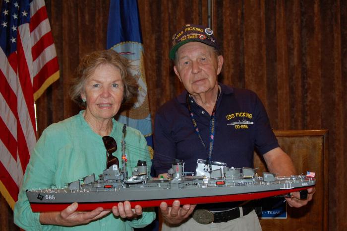 Reunion '09 San Antonio, TX - 12-15 October 20 Fredericksburg - Nimitz Museum and National Museum - Pacific The Nimitz Museum is housed in the old Nimitz Hotel which has been restored to its appearance when operated by the Nimitz family. As you can see, the front facade resembles a steamboat. We went here to dedicate a plaque to the USS Picking and all who served on her. It will be a lasting memorial to our ship and its distinguished history. Our shipmate Chuck Kemmerling has brought the model he built of the Picking to every reunion he attended. At this one, he decided to donate it to the Nimitz Museum to share her with the world. Thanks Chuck! Much of the ceremony was held inside the museum due to the grounds being wet from an earlier rain. Ian Blackie came dressed as a true Scotsman to be the piper for the event. A great meal of Texas barbequed beef and sausage was served with all the trimmings. The hall had been decorated by Jim and Donna Horn. Another World War II Picking veteran joined us for the ceremony, Billy Joe Shepherd and his wife.