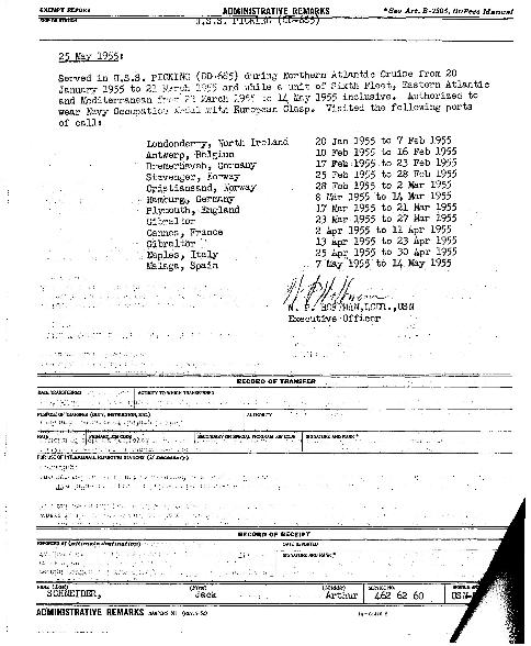 Shipmates' Memories Jack Schneider 1955 Northern Europe/Med Cruise Taken out of Newport RI, returning from a Northern Europe/Med Cruise in June 1955 Refueling from USS Elokomin (AO-55) of the Azores Picking and USS Stephen Potter (DD-538) tied up in Londonderry, Northern Ireland Tying up in Gibraltar Dress Ship in Bremerhaven, Germany Leaving the locks at Bremerhaven Picking and Potter tied up in Stavanger, Norway USS Stockham (DD-683) tied up in Monaco High line transfer on way home |